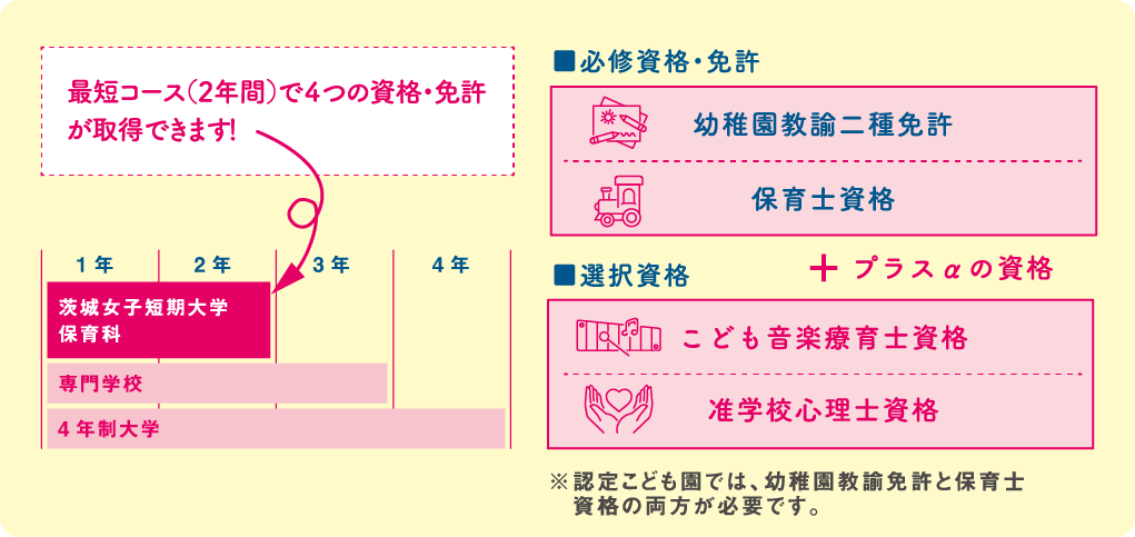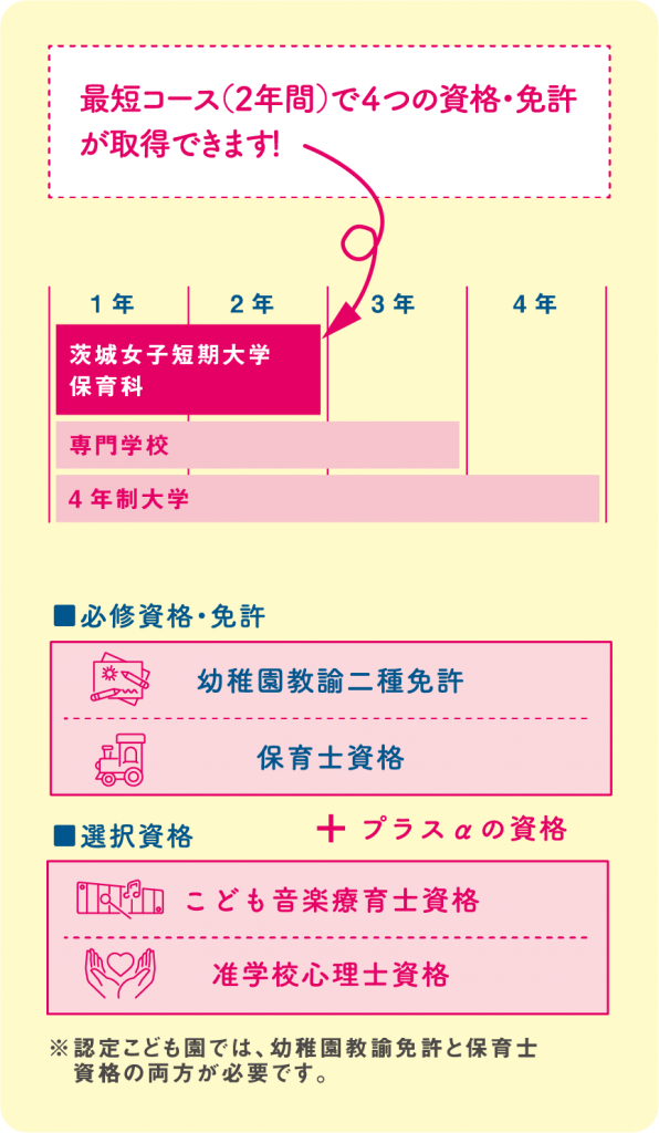 本学科では、5つの附属園という恵まれた実習環境を活かし、理論と実践をバランスよく学びながら、確かな専門性と実践力を身につけることができます。2年間で最大4つの資格取得が可能であり、幅広い進路にも対応しています。