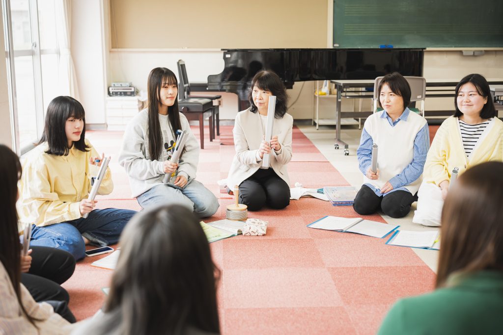 少人数グループで、幼児音楽に関する知識や技術を学びます。歌の指導法やわらべうた遊び、リトミックなどをグループディスカッションやロールプレイで実践しながら、子どもの意欲を引き出す音楽活動を構成する力を養います。