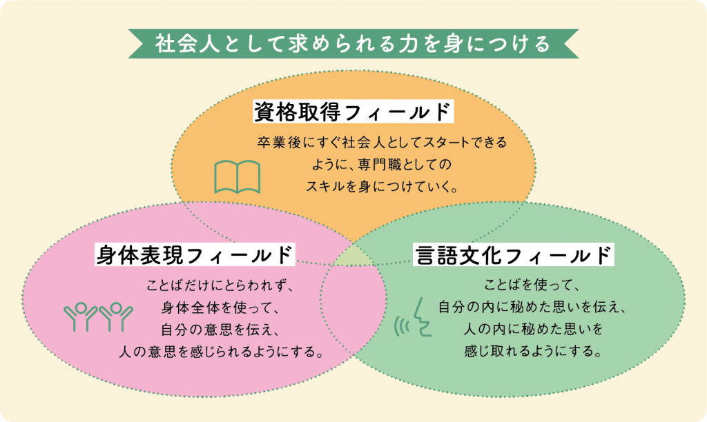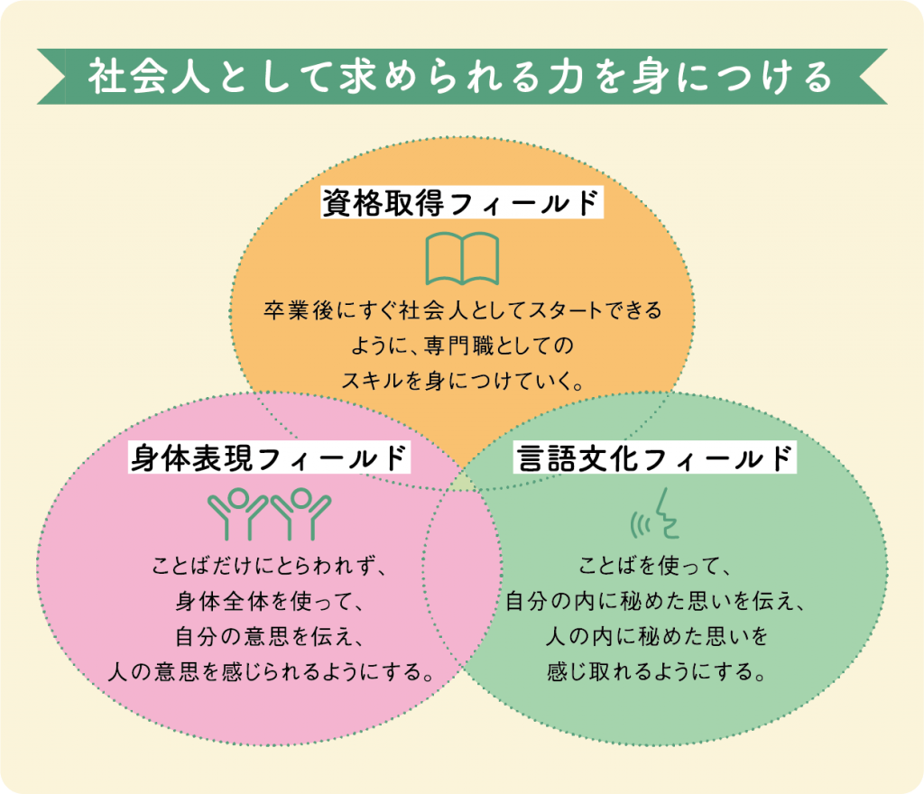 表現文化学科は、「ことば」と「からだ」の両面から表現力を磨き、豊かなコミュニケーション力を育む学科です。日本語や日本文学を深く学ぶ「言語文化フィールド」、演劇やダンスを通して自己表現を追求する「身体表現フィールド」、そして社会で即戦力となるための資格取得をめざす「資格取得フィールド」の3つを軸に、バランスよく学びを進めていきます。