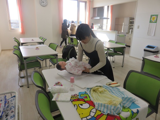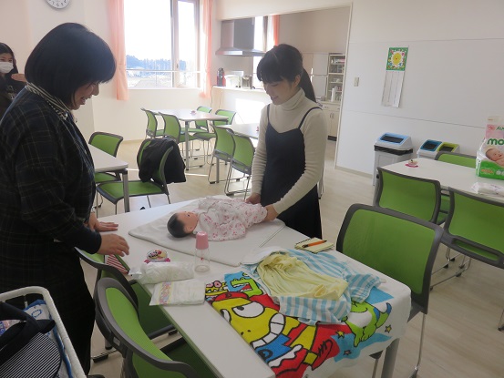 0歳児を担当するにあたって、乳児のおむつ交換に関するアドバイスを受けながら、実際に実習で乳児とうまくかかわれるよう練習をしていました。