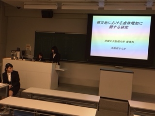この写真は、大和田りんかさん(アシスタント:尾又綾香さん)です。被災後の福島県浜通りの児童福祉について発表しました。