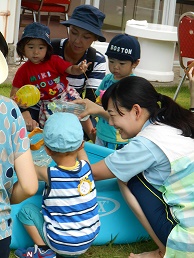 第5回 おやこひろば『ぽぽ』 2016 7/19 こども学科 7月19日(火) 第5回のおやこひろば『ぽぽ』が開催されました。 絶好の水遊び日和になり、お家から水着を着てきたお友達もいて、シャボン玉や水ヨーヨーつり、ビニールプールでの水遊びなどを楽しみました。 自分で水をかけ始めるお友達もいました。 アンパンマンと一緒に手遊びや大型紙芝居を見ました。 これから梅雨が明けると本格的な暑さが予想されます。体調に気を付けて、元気に夏を楽しんでください。 次回は10月11日(火)「砂場で遊ぼう!」の予定です。皆さんのお越しをお待ちしております。 こども学科 前の記事へ 記事一覧へ 次の記事へ