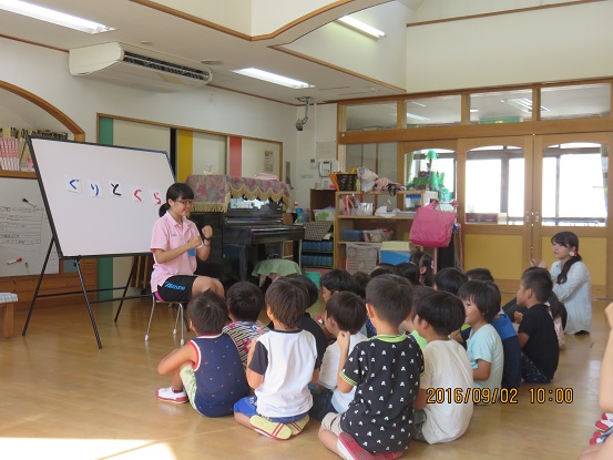 子どもたちと息を合わせて手遊びをする学生もは、緊張はしているもののいい笑顔で取り組んでいました。