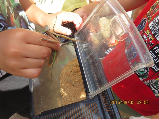 カマキリを見つけると、みんな頭を寄せ合って盛り上がっていました。