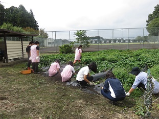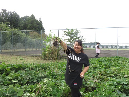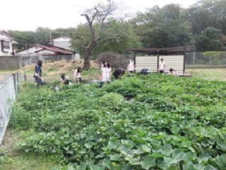 間もなく収穫の時期がきます。幼稚園の子どもたちは,本学の学生と一緒になって、さつまいもを収穫します。それに備え,今日は学生が除草作業をしました。