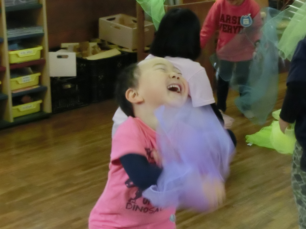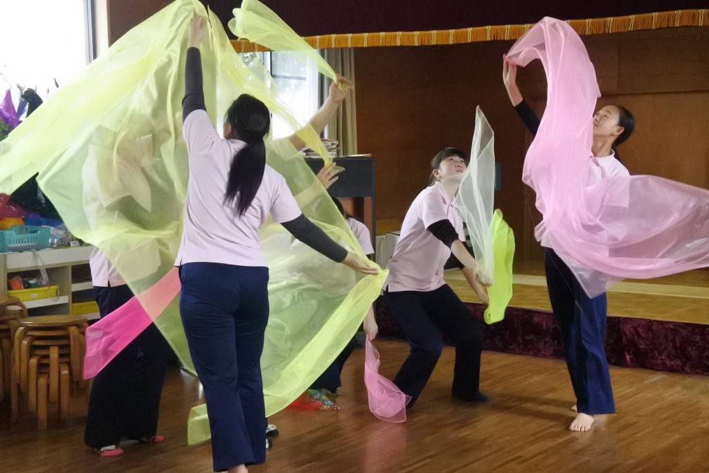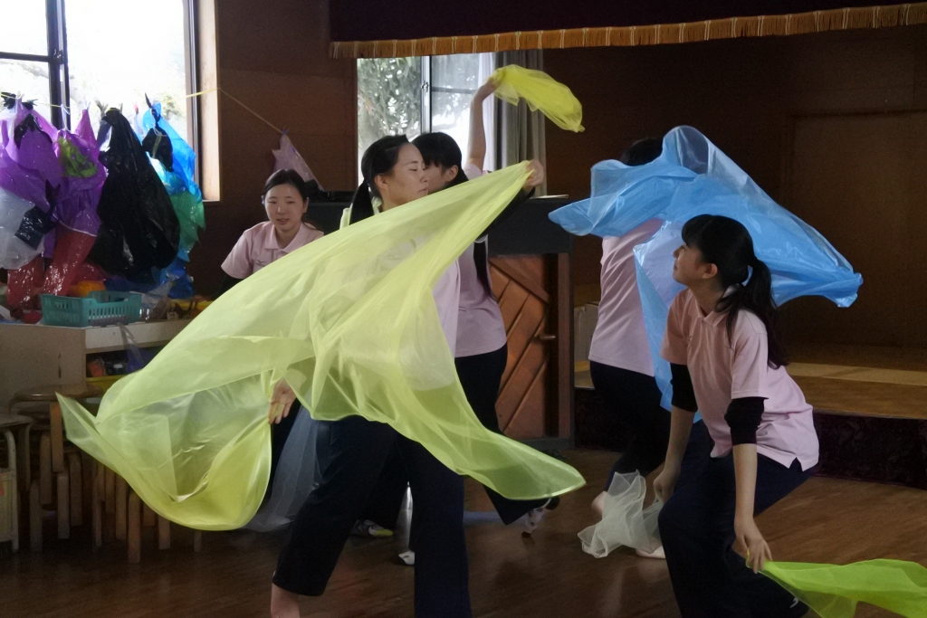 次に、オーガンジー布を用いて絵本の世界を表現したダンス作品を、子どもたちの前で披露しました。