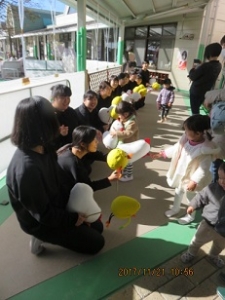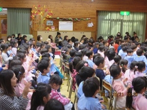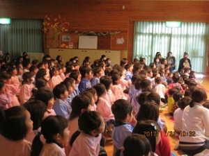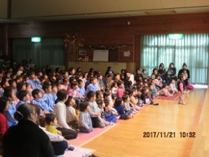 11月21日(火)11月のおやこひろば「ぽぽ」が行われました。今回は、お楽しみ会という企画で、認定こども園大成学園幼稚園の遊戯室におやこひろば『ぽぽ』に参加されているお子さんとその保護者、そして幼稚園児たちが集まり、一緒に人形劇を見ました。