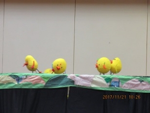 このお話に登場してくる“ひよこ”や“にわとり”の人形は、学生がこの日の発表のために時間をかけて製作してきたものです。目の前に現れた黄色のひよこの愛らしさに目を丸くして見入ってました。