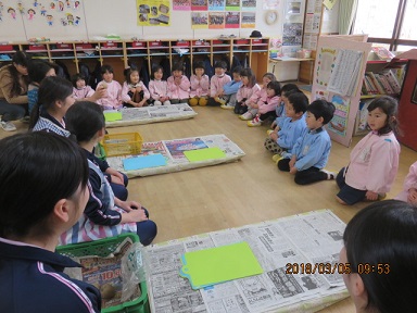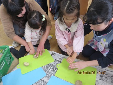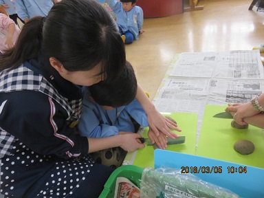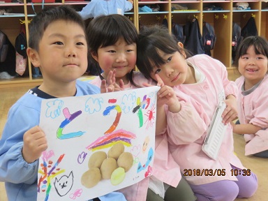 3月6日(火)、子どもたちと保育科1年の海野グループの学生がじゃがいも植えの準備をしました。植える前の大切な仕事は、『じゃがいもの種いも』の準備です。大好きなじゃがいもとあって、わくわく楽しみにしている様子が伝わってきていました。