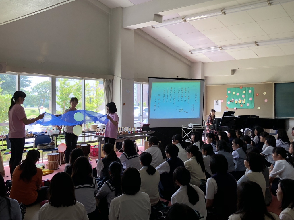 「しゃぼん玉」のピアノ演奏を例に、動作を取り入れた音楽療法の技法なども紹介されました。参加した生徒の皆さんからは「音楽は人を楽しくするもの」、「みんなが癒されるものであることが分かりました」などといった感想が述べられました。