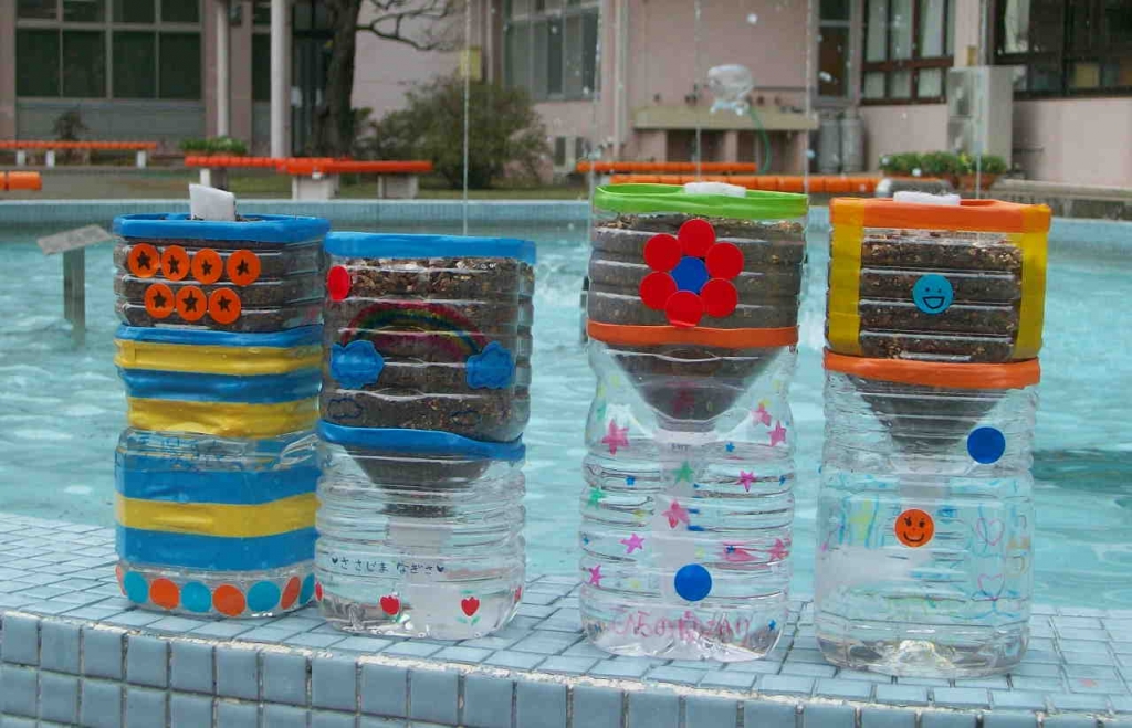 ペットボトルを楽しい水耕栽培ポットに変身させるのは、学生の得意分野。みんなそれぞれに工夫をしてかわいいものが出来上がりました。