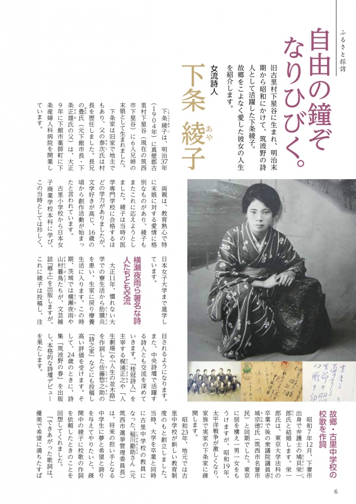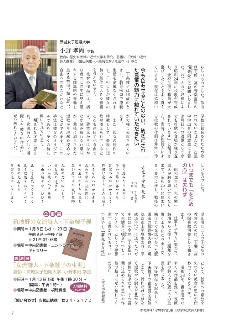 ふるさと探訪、筑波野の詩人・下条綾子についての人となりと筑西市中央図書館での企画展示会と講演会の紹介です。