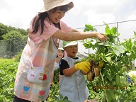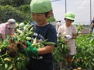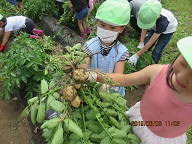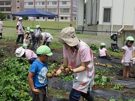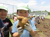 畑に入り、目を輝かせながら収穫を楽しみました。じゃがいもの葉を「よいっしょ!」と引っ張ると、大きなじゃがいもがゴロゴロ出てきました。