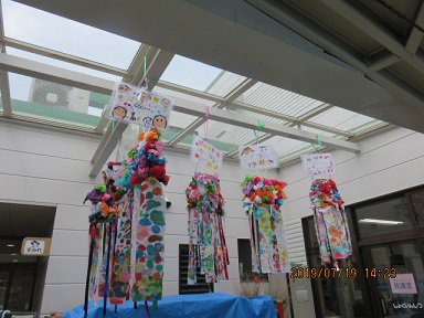園児が力を合わせてつくった風鈴やお神輿が、飾り付けられていました。学生もそれぞれ協力し合いながら、積極的に会場の準備を進めました。