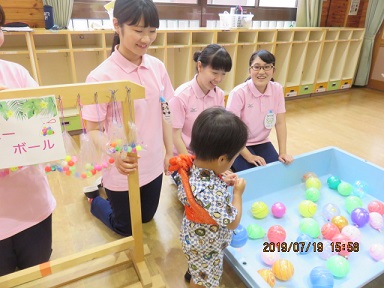 7月20日(土)の夕方、保育科1年の学生が行事実習の一環として、認定こども園大成学園幼稚園の夕涼み会に参加してきました。本来ならば、短大の芝生で開催される予定でしたが天候の心配もあり、今年は幼稚園内での計画に変更されました。