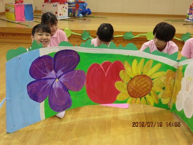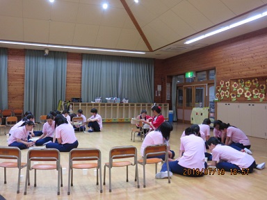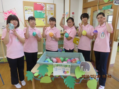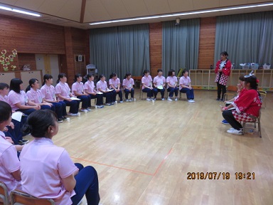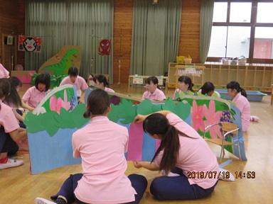 夕涼み会が終わると片付けです。幼稚園の先生方と声をかけ合い短時間で終わらせることができました。反省会では、自分たちが担当した係について話し合い、園の行事を行うためには職員が互いにアイディアを出し合い、協力して準備しなければならないことなどを学ぶことができました。行事実習を通して、一段と成長したことと思います。