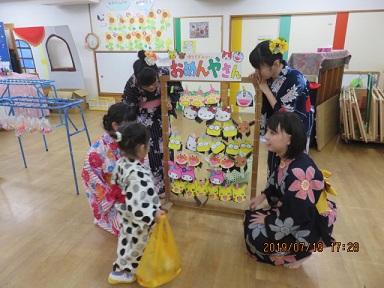 また、2年生のゼミの学生によるお面のコーナーもあり、浴衣をきたお姉さんたちから好きなお面を渡してもらっていました。子どもたちはとてもうれしそうな表情を見せていました。