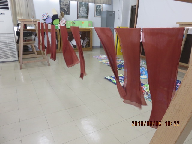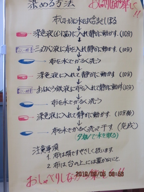 (あかね)の根を煮出した染色液に浸けたり、ミョウバンやおはぐろ鉄液などの媒染液に浸けたり…たくさんの工程がありましたが、講師の先生のお話を伺いながら楽しく進めることができました。