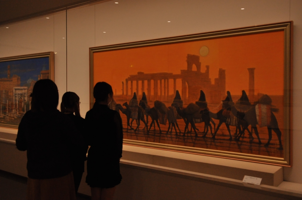 「パルミラ遺跡を行く」は、パンフレットにも掲載されている朝と夜の景色が描かれた2枚の絵画です。ラクダに乗り、ベールをかぶった人物が列を作り、遺跡と太陽や月を背景にどこかへ向かっています。朝は左の方向へ、夜は右の方向へ向かっていることから、この絵画は行きと帰りを表しているのかと考えました。また、平山郁夫シルクロード美術館のHPによると、ラクダに乗る人物は先導者以外はすべて女性だとのことで、これはパルミラの女王・ゼノビアが悲劇を迎えたことに平山郁夫氏が敬意を示したものということがわかりました。(w)