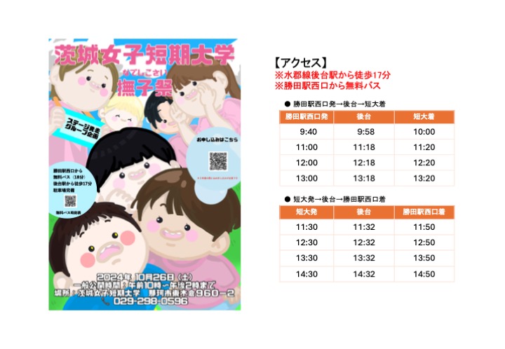 【学園祭】撫子祭!開催! 2024 10/15 ニュース 2024年10月26日(土)10:00〜14:00、本学の学園祭「撫子(なでしこ)祭」が開催されます。ステージ発表や各グループによる企画など盛りだくさんです。キッチンカーなども出店します。入試相談コーナーもあります。ぜひお越しください! なお、ご来場の際には、ご家族およびご友人は本学の学生を通じて、高校生は本学のポスターのQRコードを用いて事前にお申し込みください。入試相談コーナーをお申込みの場合は、こちらから。 ニュース 前の記事へ 記事一覧へ 次の記事へ