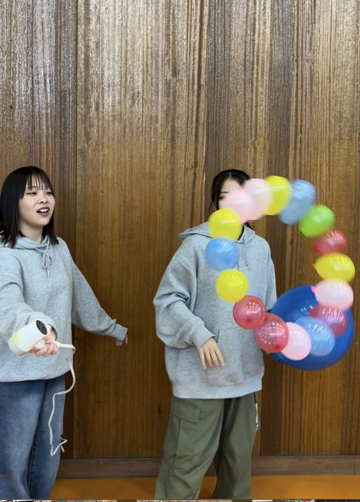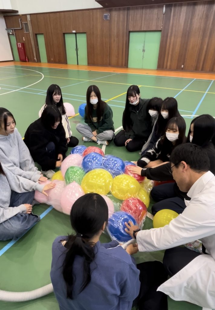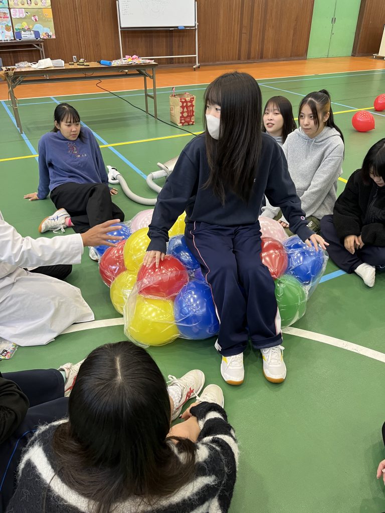 加茂川ゼミでは、11月12日のゼミナールの時間に大洗町教育委員会から川野邊先生をお招きして「風船の科学・不思議体験教室」を実施しました。カラフルな風船をたくさん膨らませて、いろんな遊びをしました。風船に針を刺しても割れない場所を探ったり、剣山に押しつけてみたりしました。風船をたくさん袋に詰めこんで袋の空気を抜いたらなんと!固いベットになりました。「風船の不思議」をたくさん発見しました。