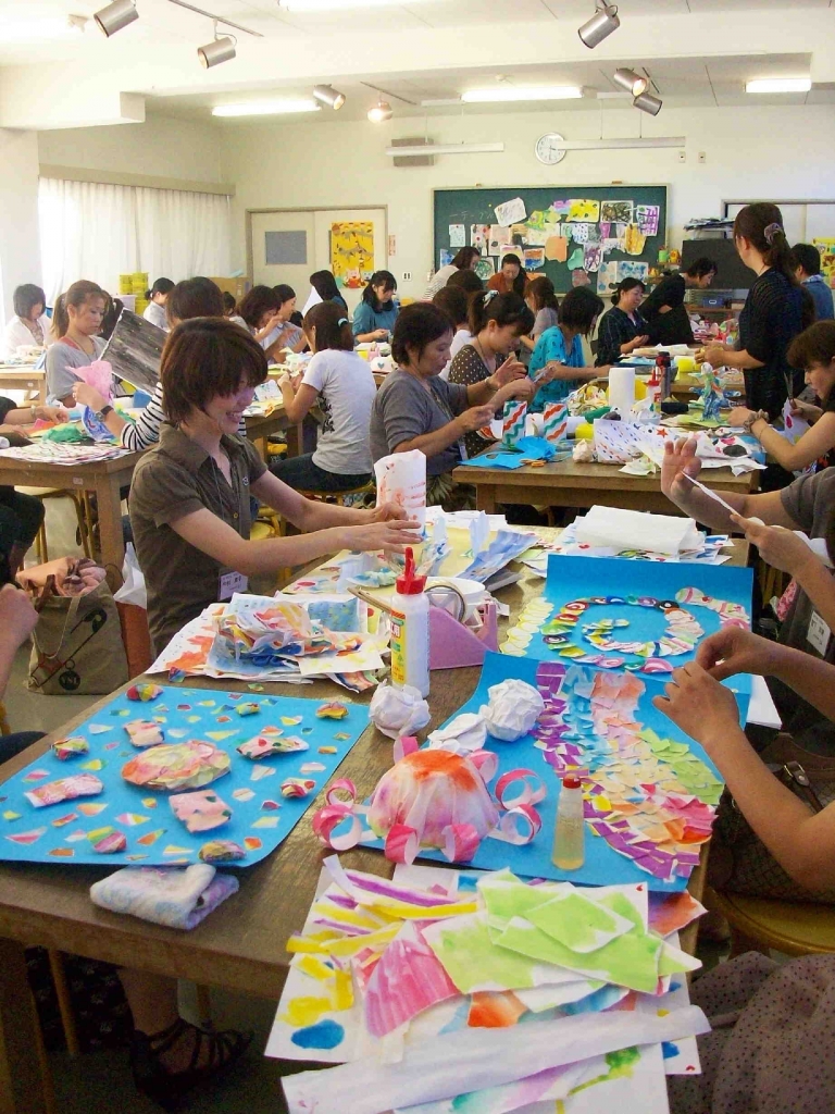 3日目の午後の科目「幼児の造形遊び」では、それぞれの先生方が夢中になって造形活動に取り組む姿が印象的でした。