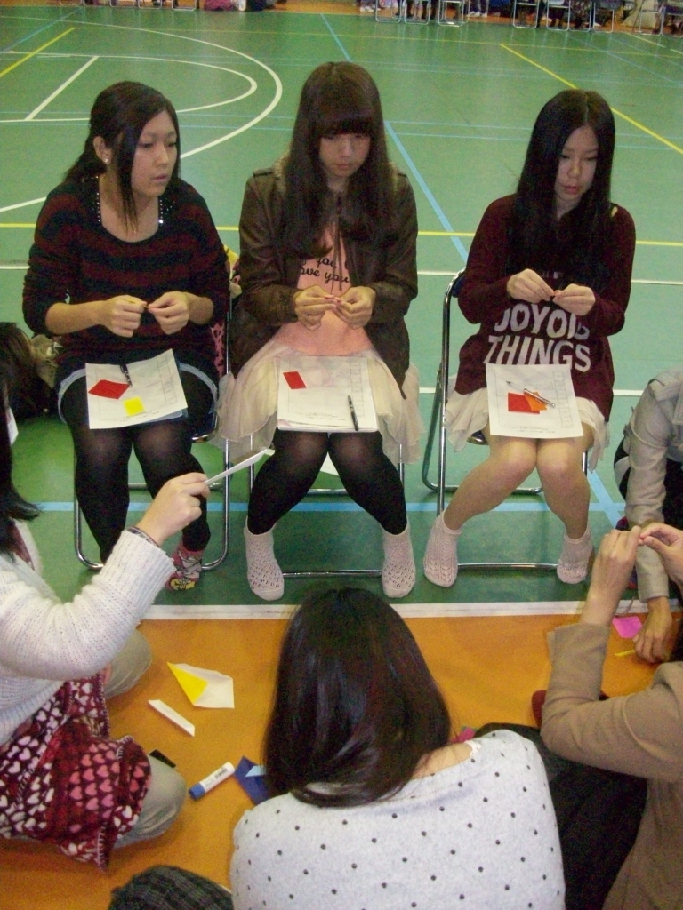 実際に使用したペープサートやパネルシアター,実習日誌,手遊びの楽譜等々を展示し,一緒に歌ったり,折り紙を折ったりして伝達しました。