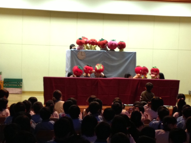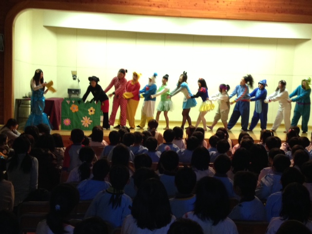 大成学園幼稚園お楽しみ会 2012 12/13 こども学科 大成学園幼稚園で保育科の学生が「おたのしみ会」を開きました。手遊び、影絵、人形劇、ミュージカルなどを約1時間ほど行いました。子どもたちは楽しそうに学生の演技に見とれていました。参加してくれたのは、大成学園幼稚園の園児と、おやこ広場「ぽぽ」の子どもたちでした。 「 おおきなかぶ」にディズニーのキャラクターが登場 手作りのおおきな「トマトちゃん」が大人気 影絵に興味津々 こども学科 前の記事へ 記事一覧へ 次の記事へ