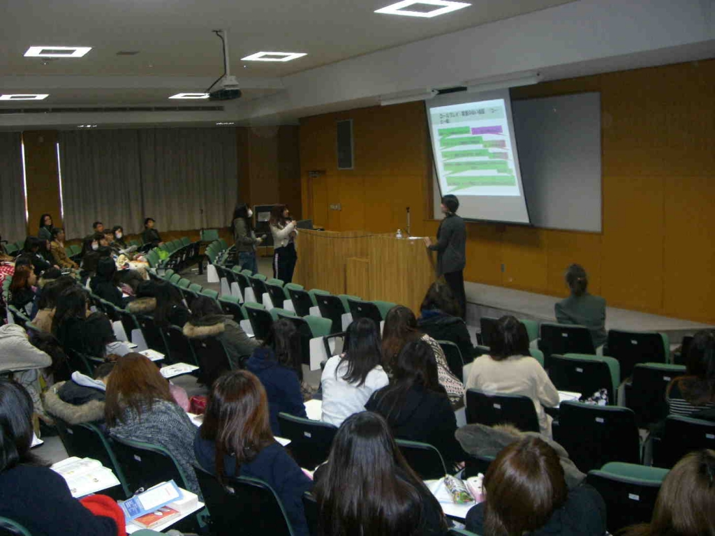 「デートDV防止」出前講座 2012 12/21 こども学科 NPO法人ウィメンズネット「らいず」の前小屋先生による講演、「デートDVって何? 知って気づいて予防する」を開催しました。パワーポイントを使って、・DVとは・暴力の種類・DVが発生する流れ・DVがもたらす心理的影響などの話を伺いました。また、学生や教員でDVと考えられる場面のるロールプレイを行い、その対応や考え方について学びました。友達から相談されたとき、家族の中でそのようなことが起こったとき、また自分自身のことで悩んだときに、ぜひ今日の話を思い出して対処してほしいと思います。 こども学科 前の記事へ 記事一覧へ 次の記事へ
