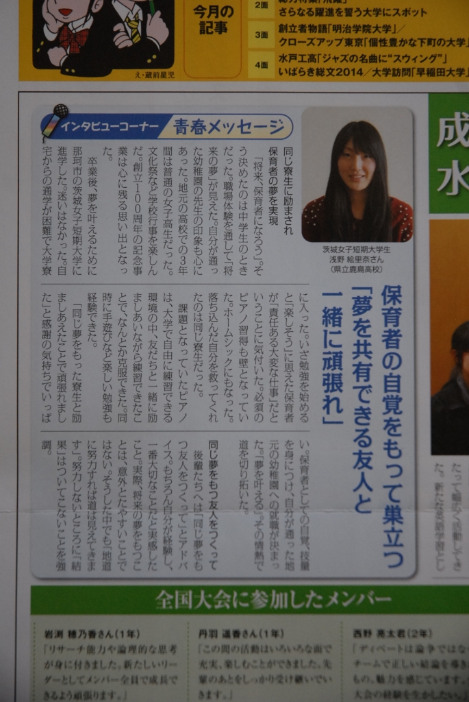 いばらき高校生新聞第14号(平成25年2月1日発行)のインタビューコーナー・青春メッセージに保育科2年浅野絵里奈さんが掲載されました。