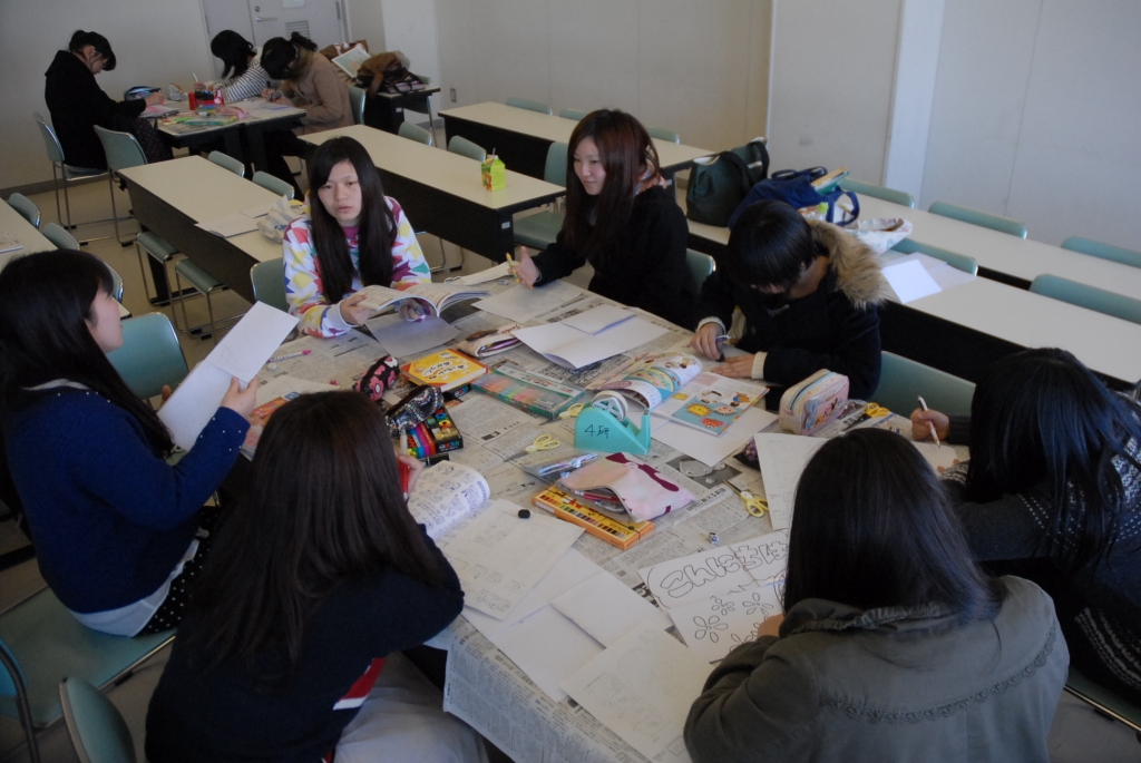 実習直前対策ゼミ 2日目 2013 2/08 こども学科 試験が終わってほっとしたのもつかの間。1年生は、2月18日(月)から始まる保育所実習に向けて準備を始めました。今日は「実習直前対策ゼミ」の2日目。「自己紹介グッズをつくろう」では、ふしぎ絵本を使っての自己紹介を考え、実際に製作しました。いろいろなアイディアで楽しい自己紹介ができそうです。元気いっぱいに自己紹介ができますように。 こども学科 前の記事へ 記事一覧へ 次の記事へ