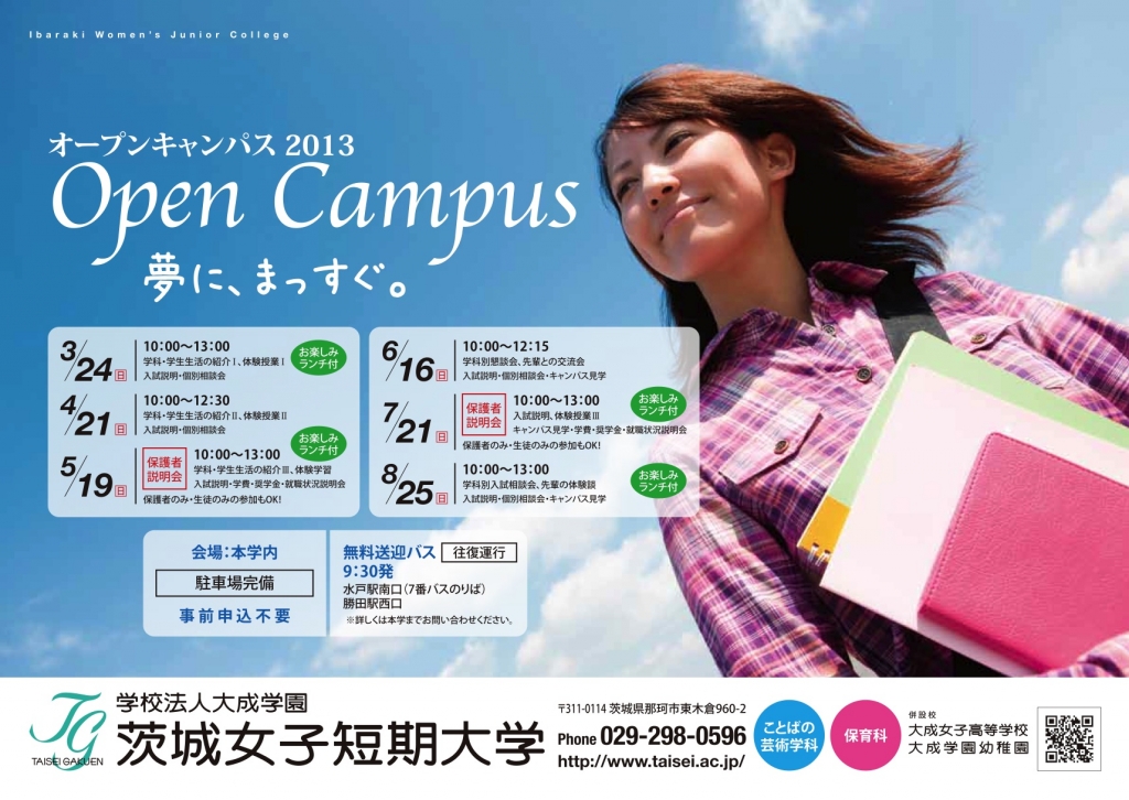 3/24オープンキャンパス 2013 3/19 ニュース 第1回オープンキャンパスが3月24日(日曜)に行われます。事前申込は不要です。 時間:10:00~13:00学科・学生生活の紹介 体験授業 入試説明・個別相談会 などお楽しみランチ付き 駐車場完備 無料送迎バス 9:30発 水戸駅南口(7番バスのりば)勝田駅西口 詳しくは本学(029-298-0596)まで平日にお問い合わせください。 新しいパンフレットも完成しました。お待ちしております。 ニュース 前の記事へ 記事一覧へ 次の記事へ