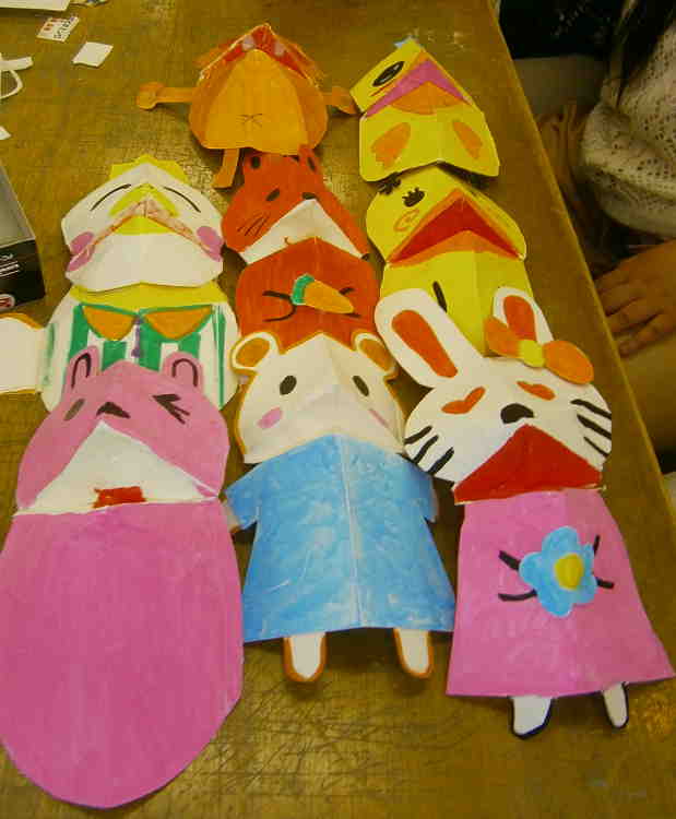 今回は、牛乳パックで動物を作りました。口がぱくぱく動き、お話をする動物です。いろいろな表情の動物ができあがりました。