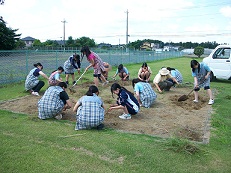 学生は小さなお友達と一緒に遊ぶことを楽しみに,砂場の砂を柔らかく掘り起こして待っていました。