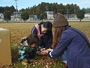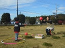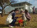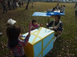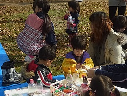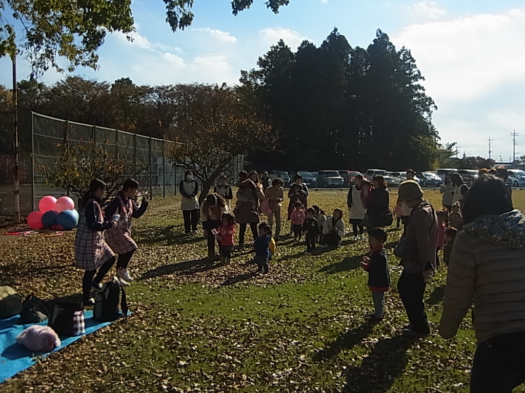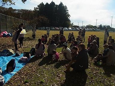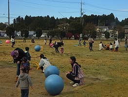 短大の芝生広場で第8回のおやこひろば『ぽぽ』が開催されました。秋晴れの青空の下で、伸び伸びと体を動かして遊びました。