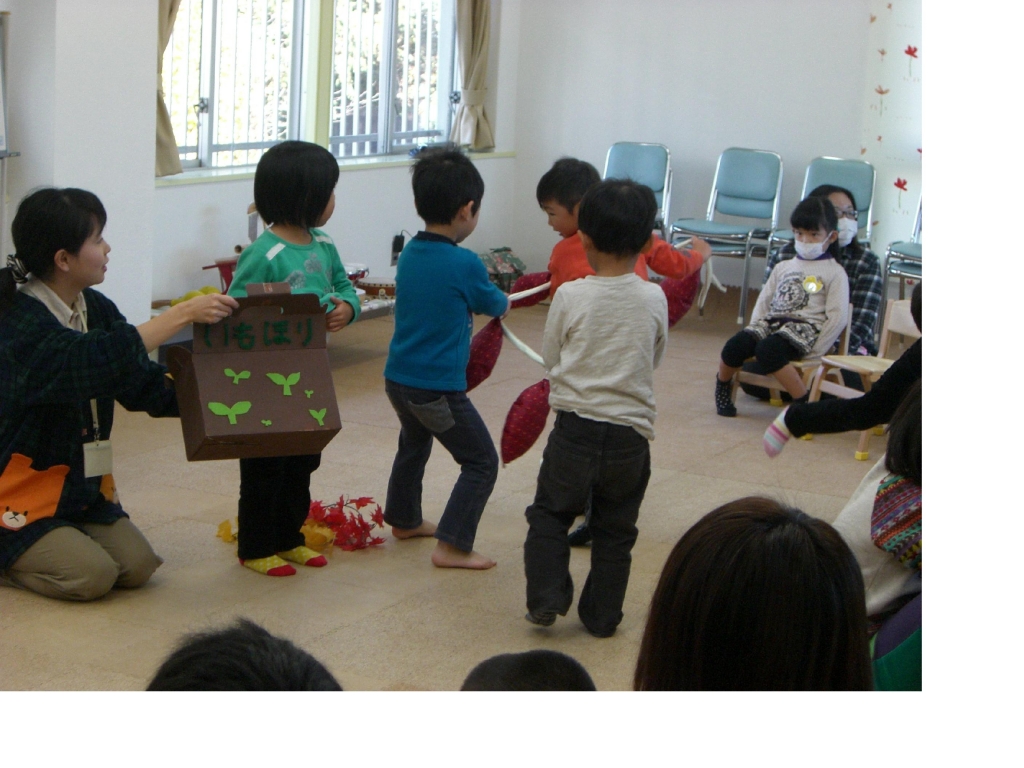「たき火」を歌ったあとに、いもほりをして「やきいもグーチーパー」を歌いながら遊びました。