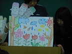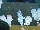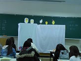 1年生は, 後期の保育表現技術(言語・教材)の授業の中で,表現する力や教材を研究する力・身近なものを使って教材を開発する力を身に付けようと絵本や紙芝居・人形劇・パネルシアター・エプロンシアター・ことばあそび・わらべうたなどについて勉強しています。