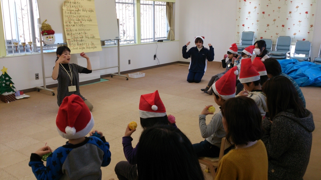 第3回「たのしい音楽あそび」 2013 12/26 こども学科 12月25日に後期4回コースの3回目の「たのしい音楽あそび」を開催しました。今日はクリスマス!クリスマスの歌を歌ったり、パネルシアターを観たり、楽器を演奏したりとたのしいひと時を過ごしました。かごりん(丸いかごの中に鈴が入っている)を持ってのハンドサイン(ドレミを体の部位を使って表します)は、3回目ということもありみんな上手に真似していました。 次回は1月18 日(土)です。 こども学科 前の記事へ 記事一覧へ 次の記事へ
