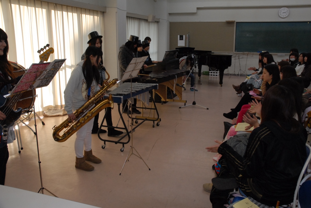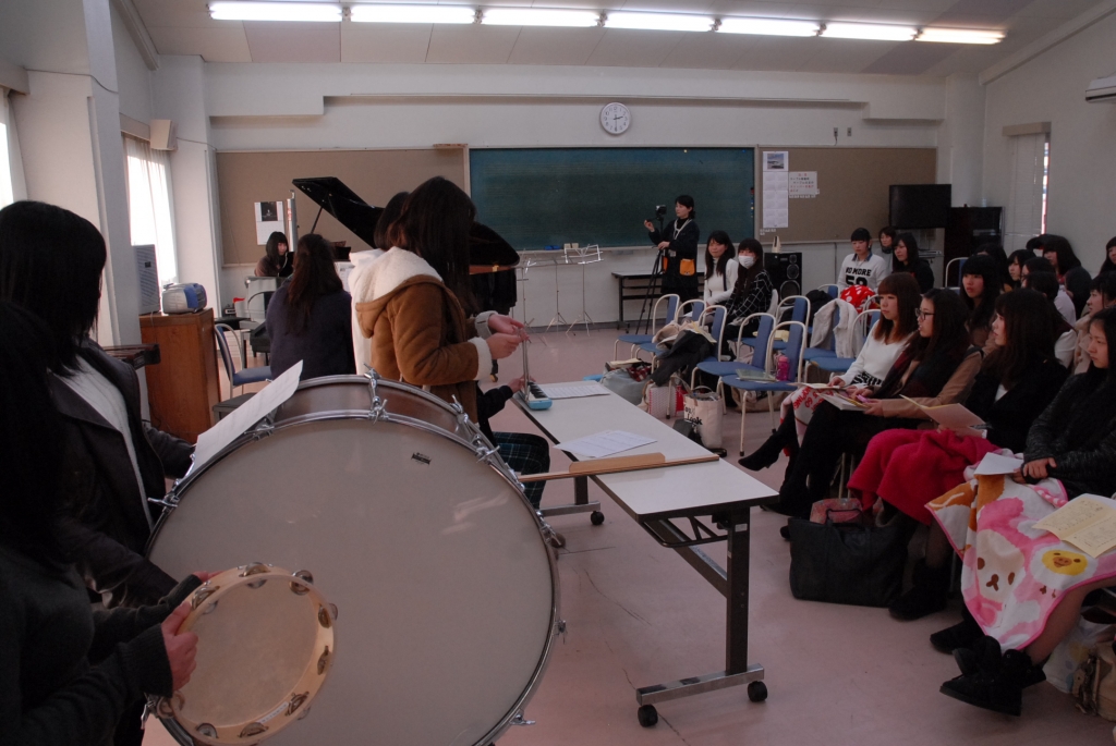 平成26年1月23日(木)音楽室にて、保育科1年生による保育表現技術(音楽Ⅲ)の成果発表会が行われた。これは、グループに分かれて授業が展開されている各グループの成果発表である。合奏、弾き歌い、ピアノ演奏など盛りだくさんの曲が披露された。