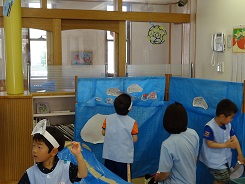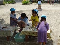 バスごっこや水族館ごっこ・色水遊びなど、楽しそうに遊ぶ園児につられて学生も笑顔で参加していました。