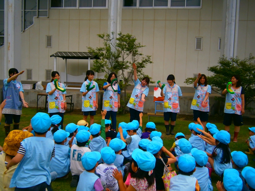 子どもたちの前でお話するのは2月の保育実習以来でしたので、学生たちも緊張していたようですが、手遊び「ワニの家族」で心が和みました。