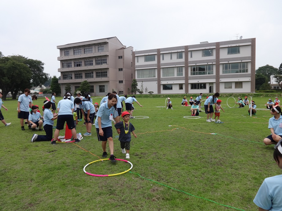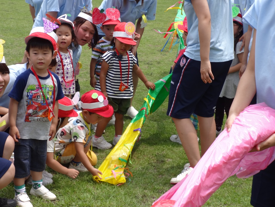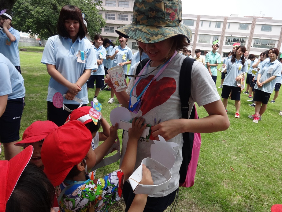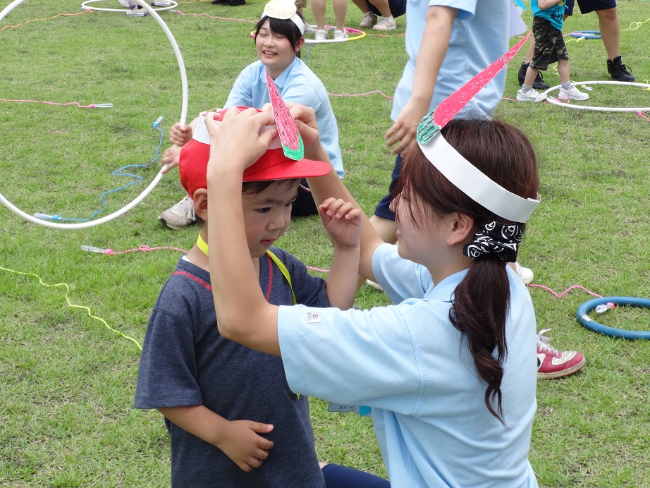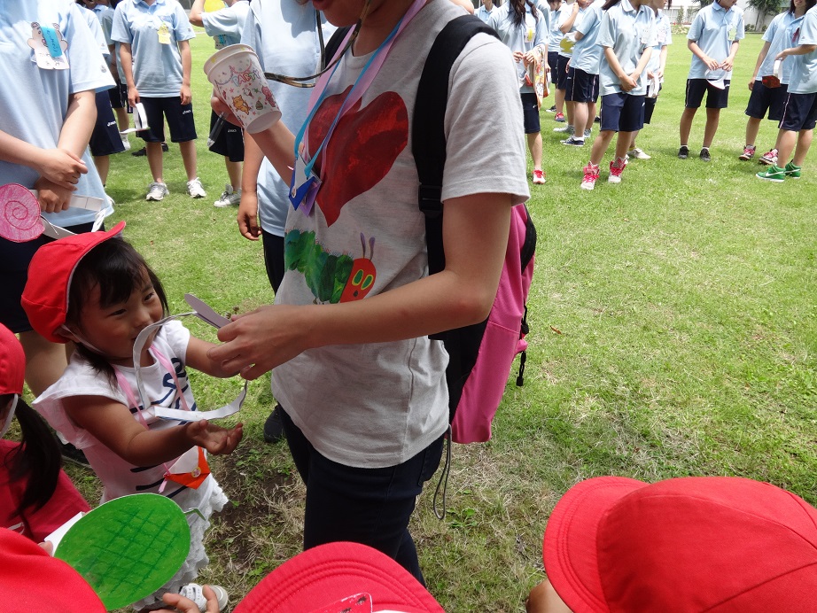 こどもたちは、お散歩をしながら、学生たちのお店屋さんで、リンゴやいちごやアイスクリームのお面を買いました。