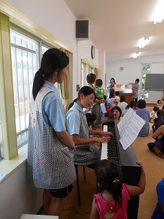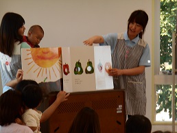 続いて「はらぺこあおむし」の大型絵本を、ピアノに合わせて学生が歌ってくれました。