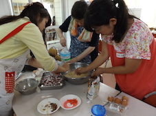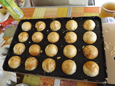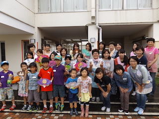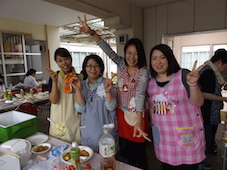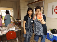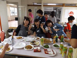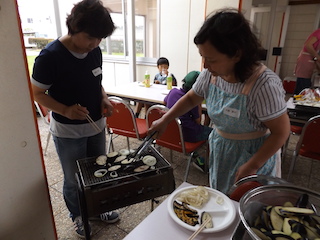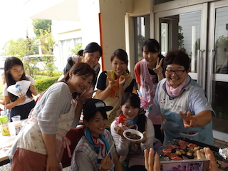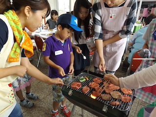 参加の子どもたちの「お肉!!お肉!!まだ?」の声でお肉やエビ、ナス、ピーマン、かぼちゃなどの野菜が網の上にのせられ、いい匂いが漂ってきました。また、いろいろな具材のたこ焼きもコロコロと焼かれお腹いっぱい食べました。最後にはデザートに甘いスイカを頂きました。