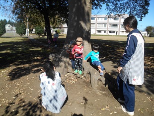 学生に見守られて、大きな木の根っこ登りにも挑戦していました。