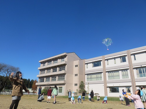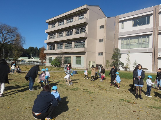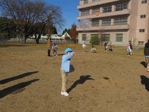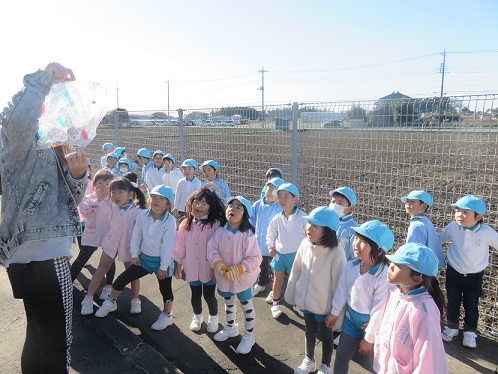 パラシュート遊びを是非、幼稚園の子どもたちにも見てもらおうと短大の庭にさくら組さんを招待しました。