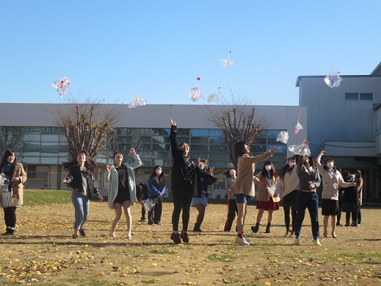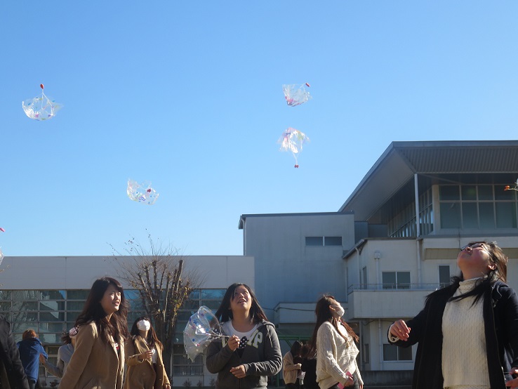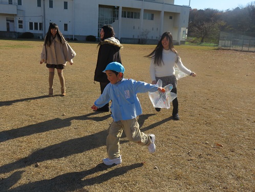 パラシュート遊びを体験したことがないのか、実際に飛ばして見ると、投げたパラシュートがふわふわと落ちてくる様子を見て大喜びする学生たちは、みんな笑顔になっていました。