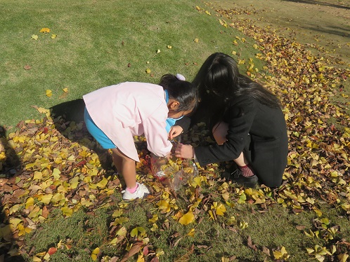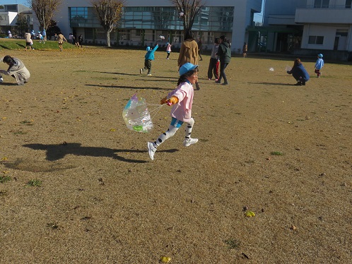 お姉さんたちのパラシュートを貸してもって、走り出す子や落ち葉を入れて飛ばして見ることを考え出す子どもたち…