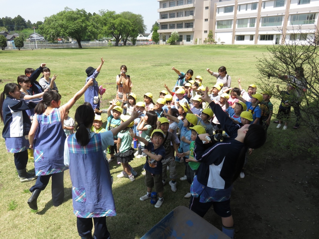 3月に植えたじゃがいも畑の様子を見に来た大成学園幼稚園の年長組さんたち・・・