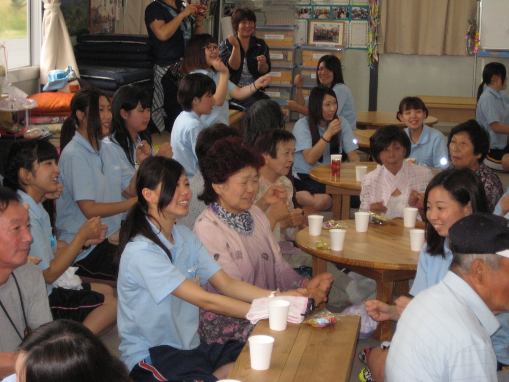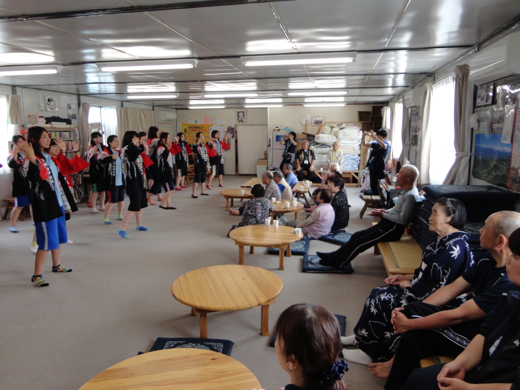 宮城県東松島市の仮設住宅地内にある集会所にて、合唱・手遊び歌・紙芝居・踊りなどを披露させていただき、マッサージをしながら色々な話を聴かせていただきました。